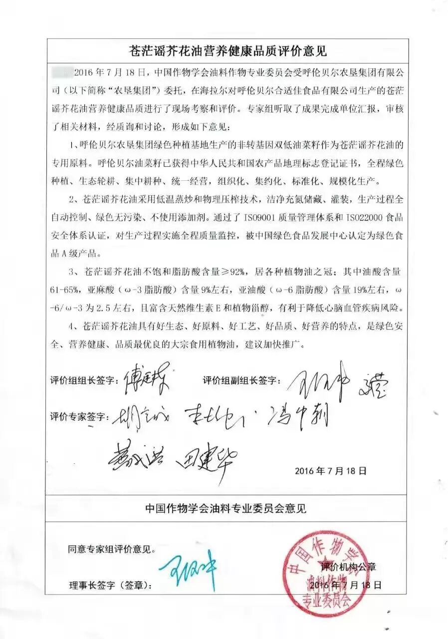 呼伦贝尔品生态—苍茫谣芥花油是农垦呼伦贝尔合适佳食品有限公司与中国农科院共同研发,精选绿色种植基地双低油菜籽作为专用原料,采用全自动化控制物理压榨生产工艺精制而成,产品亚麻酸含量为8%、亚油酸含量为17.5%、不饱和脂肪酸总量高达92.8%,在国内享有“东方橄榄油”之美誉。