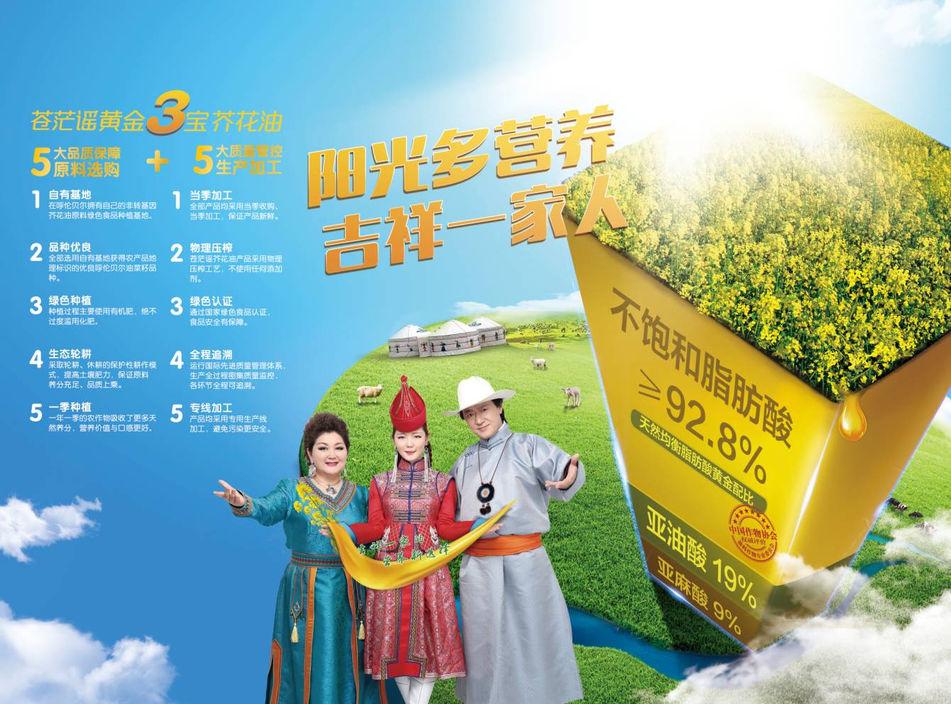 宣传升级后地域风格鲜明,增加了强调卖点的slogan。“阳光多营养,吉祥一家人”将芥花油的优势充分表达,代言人吉祥三宝的特质与产品自身特点融合,双低菜籽油的高品质,北纬49°全球公认芥花油黄金产区、充分日照的高营养,以及清爽不油腻的高烟点。
